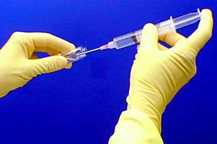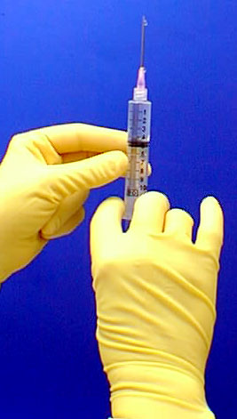 Holding the syringe vertically, push in the plunger slowly to expel the air.