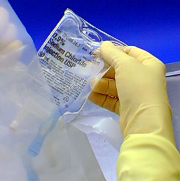 Open the outer wrap for the intravenous solution bag and place the bag in the laminar flow hood.