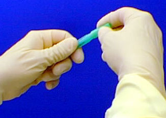 The intake septum is wiped with a sterile alcohol wipe to remove any extraneous particulates.The septum should be wiped in only one direction to push loose particles from the rubber septum to one side.