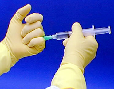 The left hand is rolled 90 degrees to the right and the filter needle is aligned with the syringe tip.