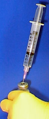 The syringe and needle containing the water is held at approximately 45 degrees, needle bevel up, just prior to entering the vial.