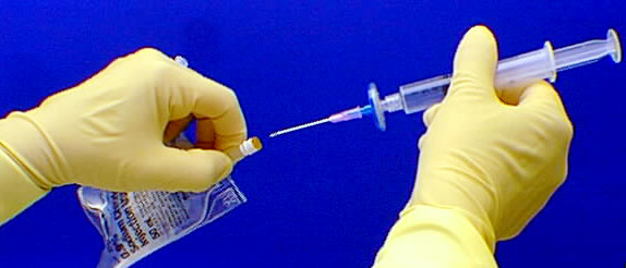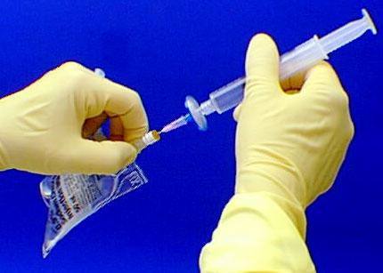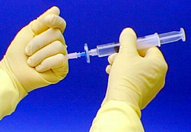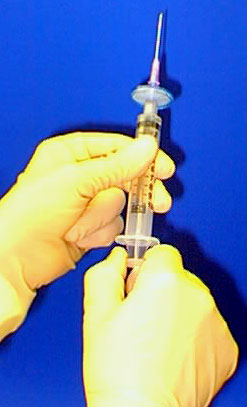 Wipe the rubber septum on the intravenous solution bag and align the needle for the center of the rubber septum.