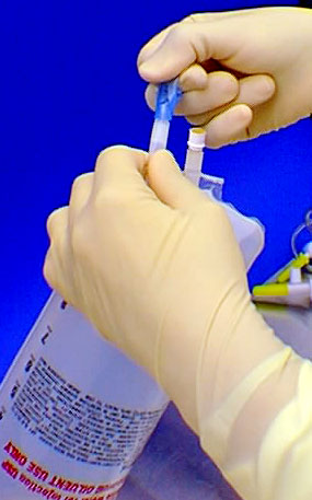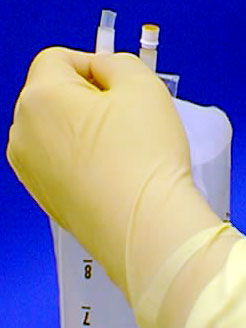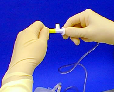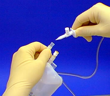 The intravenous solution outlet tube must be held firmly as the vented spike is inserted.
