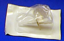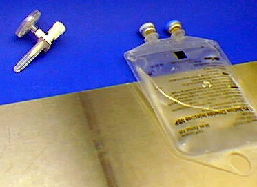 The chemo dispensing pin is really a vented spike needle. Here the filter is shown at the top. The filter should remain at the top during the reconstitution process.