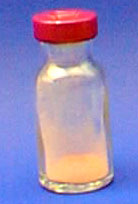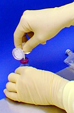The vial is opened, wiped with a sterile alcohol pad, the spike cover removed and the dispensing pin is inserted into the chemo vial.