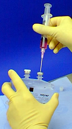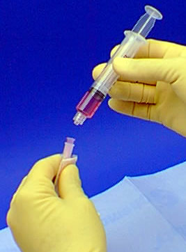 The syringe is unlocked from the chemo dispensing pin and a new needle is attached.